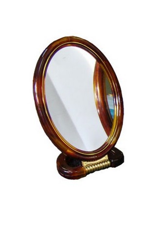 Настольное зеркало классической овальной формы в пластмассовой оправе на подставке. Наклон зеркала регулируется.