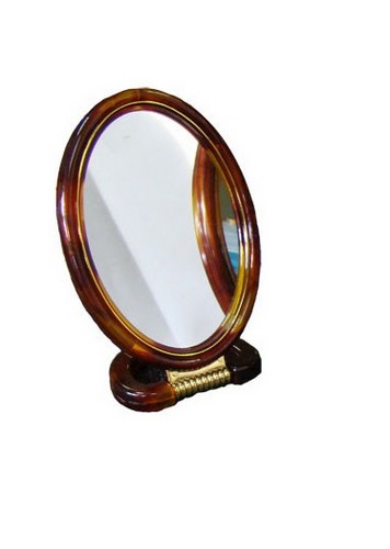 Настольное зеркало классической овальной формы в пластмассовой оправе на подставке. Наклон зеркала регулируется.