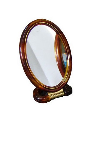 Настольное зеркало классической овальной формы в пластмассовой оправе на подставке. Наклон зеркала регулируется.