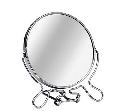 Настольное зеркало классической круглой формы в металлической оправе на подставке.