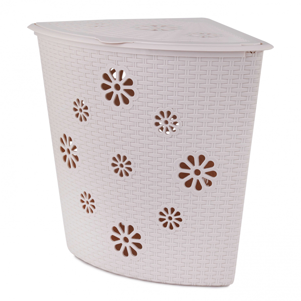 Угловая корзина изготовлена из прочного пластика и отлично подойдет для хранения белья перед стиркой. Данное изделие оснащено крышкой, что поможет скрыть содержимое корзины. Стенки корзины имитированы под плетение с небольшими отверстиями в форме цветов, которые создают идеальные условия для проветривания. Удобная и компактная корзина прекрасно впишется в интерьер любой ванной комнаты.1.466 кг 385х500х460 мм