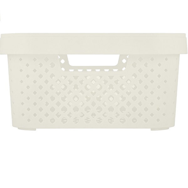 Корзина имеет удобные для переноски ручки-вырезы по бокам корпуса. Крышка на корпусе сохранит визуальный порядок, скрывая и защищая содержимое сверху.