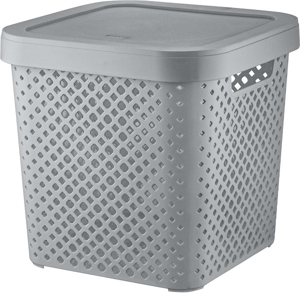 Корзина имеет удобные для переноски ручки-вырезы по бокам корпуса. Крышка на корпусе сохранит визуальный порядок, скрывая и защищая содержимое сверху.