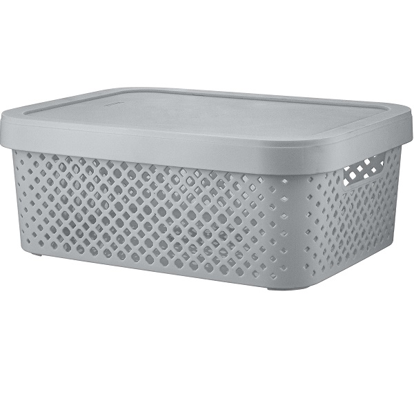 Корзина имеет удобные для переноски ручки-вырезы по бокам корпуса. Крышка на корпусе сохранит визуальный порядок, скрывая и защищая содержимое сверху.