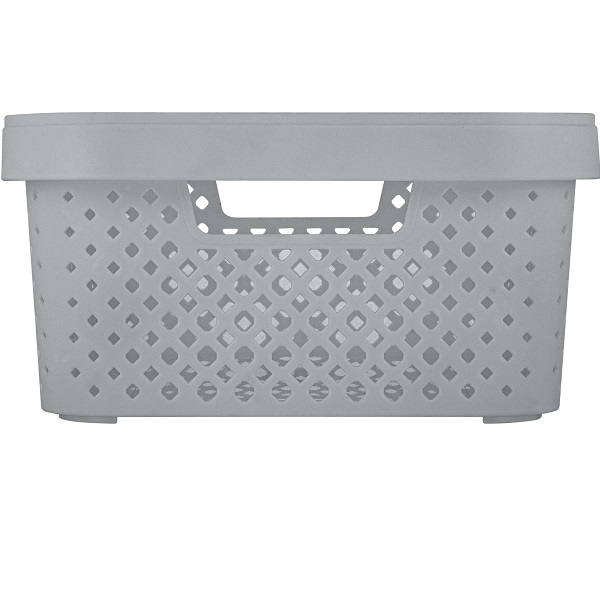 Корзина имеет удобные для переноски ручки-вырезы по бокам корпуса. Крышка на корпусе сохранит визуальный порядок, скрывая и защищая содержимое сверху.
