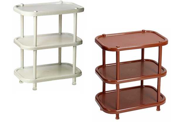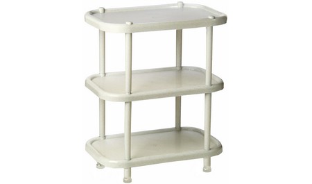Пластиковая этажерка лёгкая, устойчива к влаге, проста в уходе.