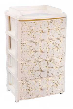 Оригинальный и функциональный комод заслужено пользуется большой популярностью среди наших покупателей. Изделие способно гармонично вписаться в интерьер любой комнаты. Комод произведен из высококачественного и безопасного полипропилена. При производстве используется только сертифицированное и экологически чистое, качественное сырье отечественных и зарубежных производителей. Данное изделие произведено на современном технологичном оборудовании, а потому отличается прочностью и устойчивостью разнообразным механическим воздействиям. Также особую прочность изделию придает цельная конструкция перегородок. Оригинальный внешний вид задает кружевная конструкция поверхности лицевой части ящика. Комод имеет четыре широких выдвижных ящика большой вместимости, в которых будет очень удобно хранить личные вещи и другие принадлежности. Благодаря небольшому весу, комод очень легко передвигается. Комод упаковывается в индивидуальную упаковку, где каждый клиент сможет найти инструкцию по сборке.6.2 кг 425х560х925 мм