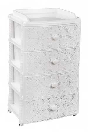Оригинальный и функциональный комод заслужено пользуется большой популярностью среди наших покупателей. Изделие способно гармонично вписаться в интерьер любой комнаты. Комод произведен из высококачественного и безопасного полипропилена. При производстве используется только сертифицированное и экологически чистое, качественное сырье отечественных и зарубежных производителей. Данное изделие произведено на современном технологичном оборудовании, а потому отличается прочностью и устойчивостью разнообразным механическим воздействиям. Также особую прочность изделию придает цельная конструкция перегородок. Оригинальный внешний вид задает кружевная конструкция поверхности лицевой части ящика. Комод имеет четыре широких выдвижных ящика большой вместимости, в которых будет очень удобно хранить личные вещи и другие принадлежности. Благодаря небольшому весу, комод очень легко передвигается. Комод упаковывается в индивидуальную упаковку, где каждый клиент сможет найти инструкцию по сборке.6.2 кг 425х560х925 мм