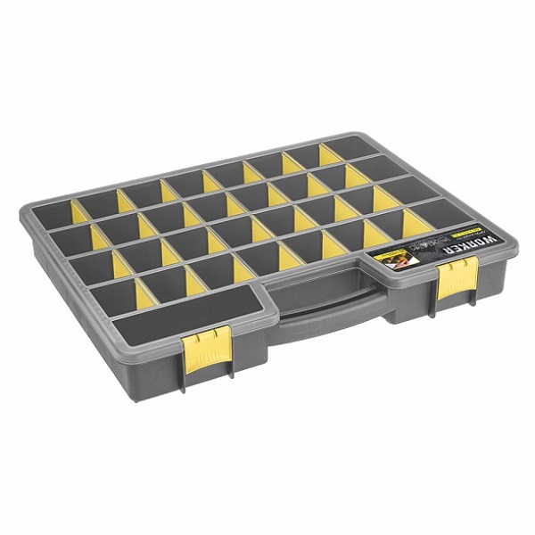 Органайзер для строительных материалов линейки "WORKER" поможет рассортировать крепежные и другие материалы: саморезы, гвозди, дюбели, болты, винты и пр. Внутри органайзера - съёмные подвижные разделители, с помощью которых при необходимости можно сформировать ячейки нужного размера. Прочные замки не позволят органайзеру раскрыться и просыпать содержимое. Благодаря цельной округлой ручке органайзер удобно переносить или снимать с полки. Прозрачная крышка позволяет видеть, что именно хранится внутри. Изготавливается из 100% перерабатываемого прочного безопасного полипропилена, не боится влажности и перепадов температур, легко моется.
