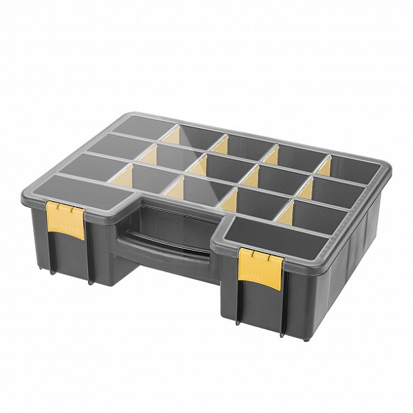 Органайзер для строительных материалов линейки "WORKER" поможет рассортировать крепежные и другие материалы: саморезы, гвозди, дюбели, болты, винты и пр. Внутри органайзера - съёмные подвижные разделители, с помощью которых при необходимости можно сформировать ячейки нужного размера. Прочные замки не позволят органайзеру раскрыться и просыпать содержимое. Благодаря цельной округлой ручке органайзер удобно переносить или снимать с полки. Прозрачная крышка позволяет видеть, что именно хранится внутри. Изготавливается из 100% перерабатываемого прочного безопасного полипропилена, не боится влажности и перепадов температур, легко моется.