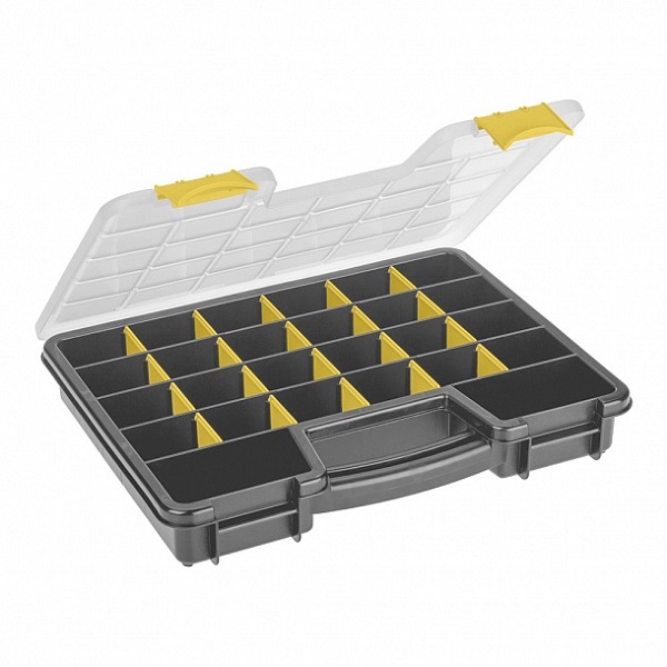 Органайзер для строительных материалов линейки "WORKER" поможет рассортировать крепежные и другие материалы: саморезы, гвозди, дюбели, болты, винты и пр. Внутри органайзера - съёмные подвижные разделители, с помощью которых при необходимости можно сформировать ячейки нужного размера. Прочные замки не позволят органайзеру раскрыться и просыпать содержимое. Благодаря цельной округлой ручке органайзер удобно переносить или снимать с полки. Прозрачная крышка позволяет видеть, что именно хранится внутри. Изготавливается из 100% перерабатываемого прочного безопасного полипропилена, не боится влажности и перепадов температур, легко моется.