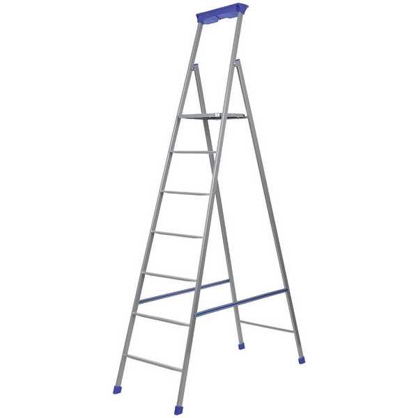 Стремянка металлическая 7 ступеней профильных, высота до рабочей площадки 1505 мм, ширина ступени 30мм, многофункциональный лоток для инструментов, страховочная лента, максимальная нагрузка 100кг, вес изделия-8,6кг.
