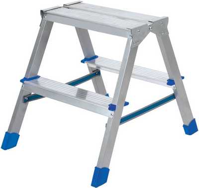 Лестница-стремянка двухсторонняя 2 ступени широкие, высота до рабочей площадки 460мм, размер площадки 395х195мм, ширина ступени 82 мм, страховочная лента, максимальная нагрузка нагрузка 150кг, вес изделия-2,6кг.