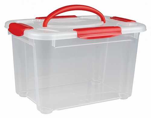 Крышка ящика плотно фиксируется с помощью четырех замков по периметру. Благодаря удобной прочной ручке ящик можно переносить с места на место. Специальная выемка на крышке позволяет спрятать ручку для возможности штабелирования коробок. Изготовлен из безопасного полипропилена, не имеет острых углов.