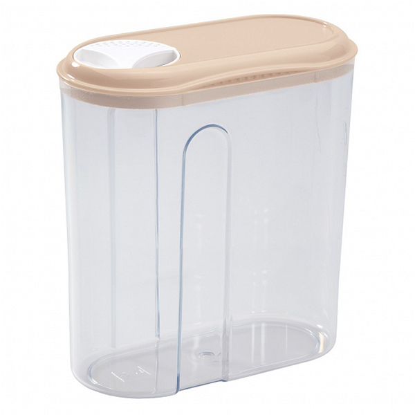 Емкость для сыпучих продуктов имеет овальную форму, специальные углубления позволяют комфортно удерживать емкость в руках. Возможна установка одной емкости на другую для рационального размещения на полке и в шкафу. Удобный дозатор позволяет высыпать содержимое, не снимая крышки. Три положения дозатора (закрыто, открыто, открыто «сито»).