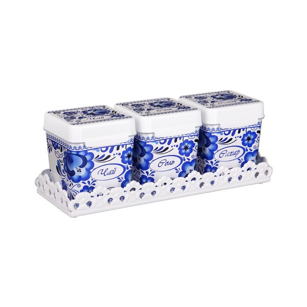 Набор емкостей на полке решает проблему рационального размещения самых необходимых продуктов. Тематическая надпись на емкостях говорит о том, что нужно хранить внутри: чай, сахар, соль. Яркий рисунок нанесен на изделия при помощи технологии IML. Он не стирается и не повреждается в процессе эксплуатации. Декор дарит особый колорит изделию и создает определенную стилистику кухни. В комплект каждой емкости входит мерная ложка для удобства использования. Изделие изготовлено из качественного пластика, безопасного для здоровья человека.0.51 кг 380х135х145 мм