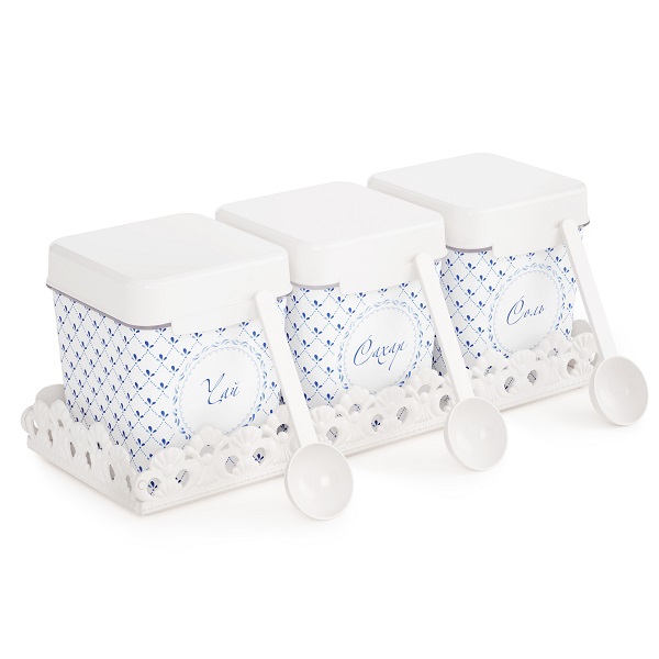 Набор емкостей на полке решает проблему рационального размещения самых необходимых продуктов. Тематическая надпись на емкостях говорит о том, что нужно хранить внутри: чай, сахар, соль. Яркий рисунок нанесен на изделия при помощи технологии IML. Он не стирается и не повреждается в процессе эксплуатации. Декор дарит особый колорит изделию и создает определенную стилистику кухни. В комплект каждой емкости входит мерная ложка для удобства использования. Изделие изготовлено из качественного пластика, безопасного для здоровья человека.0.51 кг 380х135х145 мм
