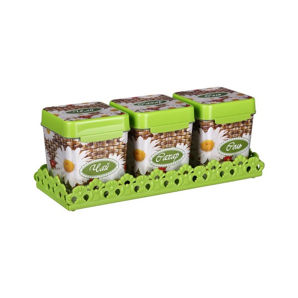 Набор емкостей на полке решает проблему рационального размещения самых необходимых продуктов. Тематическая надпись на емкостях говорит о том, что нужно хранить внутри: чай, сахар, соль. Яркий рисунок нанесен на изделия при помощи технологии IML. Он не стирается и не повреждается в процессе эксплуатации. Декор дарит особый колорит изделию и создает определенную стилистику кухни. В комплект каждой емкости входит мерная ложка для удобства использования. Изделие изготовлено из качественного пластика, безопасного для здоровья человека.0.51 кг 380х135х145 мм