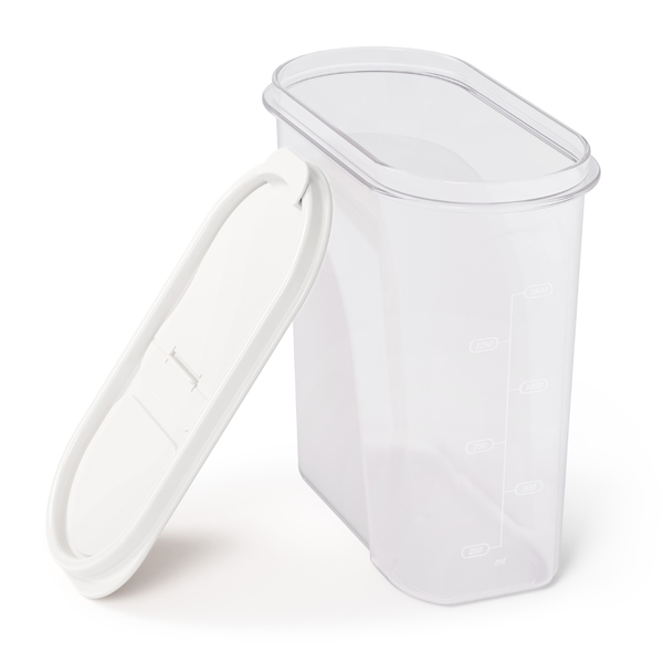 Хранение и использование различных сыпучих продуктов становится очень комфортным благодаря овальной форме ёмкости, углублению на корпусе для удобного захвата и специальной крышке. Прозрачность ёмкости позволяет видеть содержимое, а мерная шкала – его количество. Крышка плотно прилегает к корпусу и защищает содержимое от проникновения влаги и жучков. Откидная часть крышки позволяет дозировано высыпать продукт из ёмкости. Матовое покрытие на углубленной части корпуса препятствует выскальзыванию ёмкости из рук.0.157 кг 190х95х185 мм