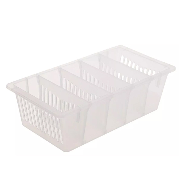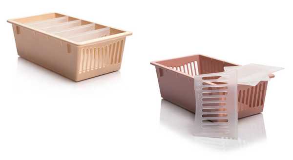 Контейнер подразделен специальными вставками на 5 секций равного размера. В случае необходимости, данные вставки легко снимаются, оставляя к использованию одну большую емкость.