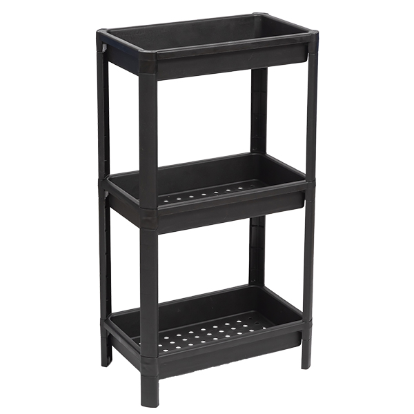 Этажерка широкая серии VIKEA - это идеальное решение для организации пространства на Вашей кухне, в ванной, в гостиной, прихожей или балконе, а также в любом другом помещении. Этажерка представлена в универсальных цветах – белом, черном и сером, она отлично впишется в любой интерьер и станет гармоничной частью дизайна. Изделие состоит из 3-х полок. Она очень удобная и компактная, но в тоже время вместительная и прекрасно впишется в пространство любой комнаты. Стеллаж имеет оптимальное расстояние между полками, это позволяет разместить все самые необходимые полезные в хозяйстве мелочи. Стойки сконструированы таким образом, что при их монтаже создаётся надёжное соединение с полкой - это обеспечивает монолитность конструкции и дает возможность легко поднять и переместить этажерку за верхнюю полку. Каркас этажерки выполнен из прочного пластика и не прихотлив в уходе, достаточно протереть влажной губкой или промыть под струей теплой воды. На дне каждой полки имеются отверстия, благодаря которым влага не будет нака