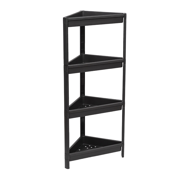 Этажерка угловая серии VIKEA — это идеальное решение для организации пространства на Вашей кухне, в ванной, в гостиной, прихожей или балконе, а также в любом другом помещении. Этажерка представлена в универсальных цветах – белом, черном и сером, она отлично впишется в любой интерьер и станет гармоничной частью дизайна. Изделие состоит из 4-х полок. Она очень удобная и компактная, но в тоже время вместительная и прекрасно впишется в пространство любой комнаты. Стеллаж имеет оптимальное расстояние между полками, это позволяет разместить все самые необходимые полезные в хозяйстве мелочи. Стойки сконструированы таким образом, что при их монтаже создаётся надёжное соединение с полкой — это обеспечивает монолитность конструкции и дает возможность легко поднять и переместить этажерку за верхнюю полку. Каркас этажерки выполнен из прочного пластика и не прихотлив в уходе, достаточно протереть влажной губкой или промыть под струей теплой воды. На дне каждой полки имеются отверстия, благодаря которым влага н