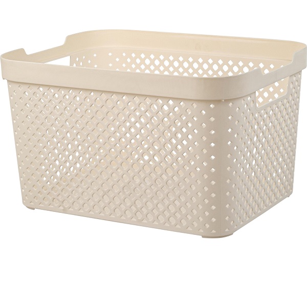 Корзина имеет удобные для переноски ручки-вырезы по бокам корпуса. Крышка на корпусе сохранит визуальный порядок, скрывая и защищая содержимое сверху.