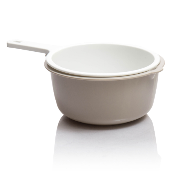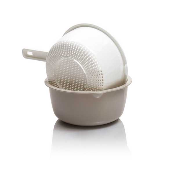 Это инновационное изделие, состоящее из двух частей, большого и малого дуршлага, выполненных в различных цветах. Оба дуршлага имеют безопасную эргономичную ручку, которая удобно помещается в руке благодаря своей форме.