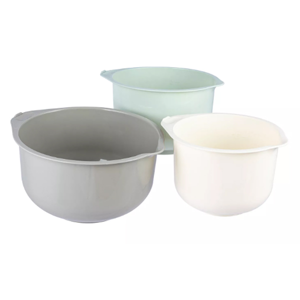 Набор состоит из трех мисок различного размера. Миски имеют стильный дизайн и удобной форменный носик, облегчающий переливание жидких видов продуктов .