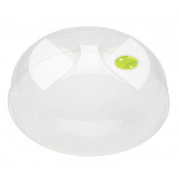 Крышка с клапаном для выпуска пара предохраняет внутреннюю поверхность микроволновой печи от загрязнения в процессе разогревания или приготовления пищи (с открытым клапаном). Клапан для выпуска пара имеет два положения: открыт/закрыт. Имеется удобная ручка для удержания крышки. Можно использовать в холодильнике, как крышку для торта, сыра и т.п. Не впитывает запахи, можно мыть в посудомоечной машине.