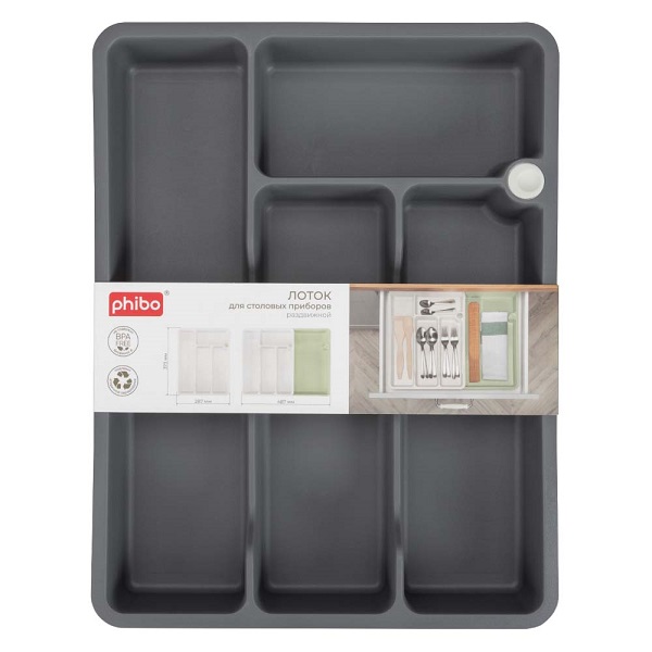 Раздвижной лоток для столовых приборов позволяет максимально использовать пространство кухонного ящика. Четыре отделения разного размера и одно выдвижное отделение позволят удобно расположить столовые предметы, отделив их друг от друга. Лоток подходит для любых кухонных ящиков. Ширина лотка регулируется благодаря раздвижному механизму от 29см до 49 см. Лоток выполнен из износостойкого пищевого пластика, устойчивого к царапинам, легко моется и не впитывает запахи. Можно мыть в посудомоечной машине.