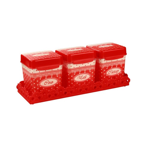 Набор емкостей на полке решает проблему рационального размещения самых необходимых продуктов. Тематическая надпись на емкостях говорит о том, что нужно хранить внутри: чай, сахар, соль. Яркий рисунок нанесен на изделия при помощи технологии IML. Он не стирается и не повреждается в процессе эксплуатации. Декор дарит особый колорит изделию и создает определенную стилистику кухни. В комплект каждой емкости входит мерная ложка для удобства использования. Изделие изготовлено из качественного пластика, безопасного для здоровья человека.0.51 кг 380х135х145 мм