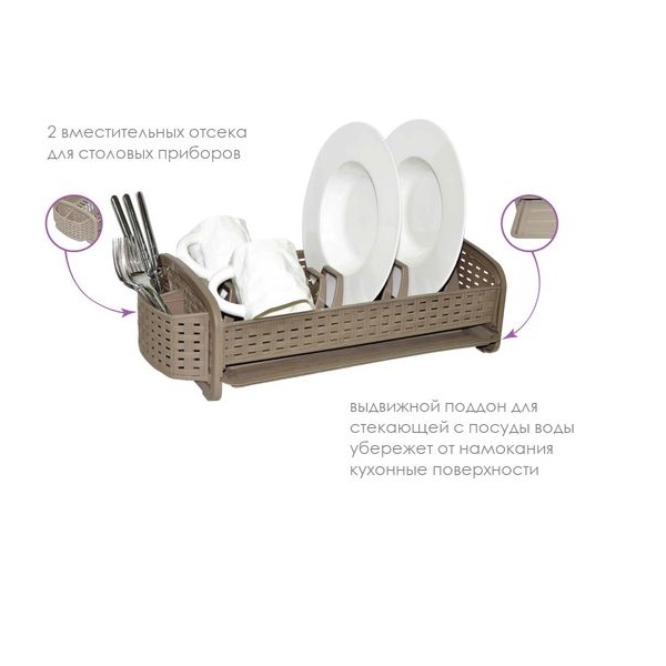 Изделие из пищевого пластика для сушки вымытой посуды. Имеет секции для размещения тарелок и столовых приборов. Съемный поддон соберет остатки воды, которая стекает с посуды. Текстура с имитацией натурального плетения «Ротанг» привнесет уют в ваш интерьер и придаст индивидуальность.
