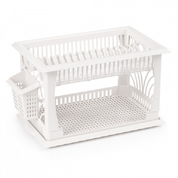 Изделие предназначено для сушки кухонной утвари. Верхний ярус позволяет размещать тарелки, а нижний ярус – чашки или другую глубокую посуду. На боковой стойке, соединяющей два яруса, располагается специальный карман для сушки столовых приборов. Поддон позволяет собрать стекающие капли и защитить поверхность стола от влаги.