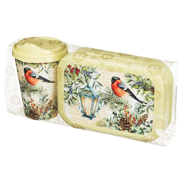 Набор: стакан с крышкой 420мл с декором НГ + ланч-бокс 0,85л с декором (салатовый)