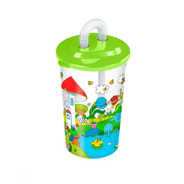Стакан 400мл с декором и трубочкой "ЛЕСНАЯ СКАЗКА" (Зеленый)(то)
