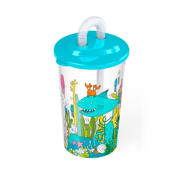Стакан 400мл с декором и трубочкой "МОРСКОЙ МИР" (Зеленый)(то)