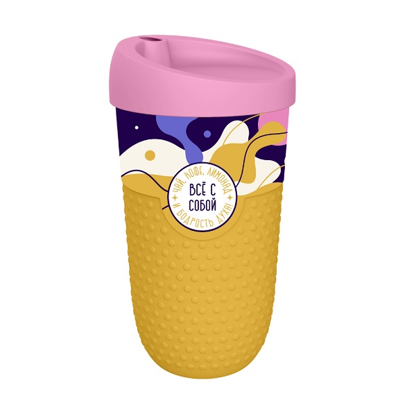Стакан для горяч. и холодн. напитков с крышкой и декором 550мл (желтый)(то)