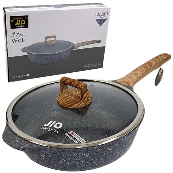 Сковорода глубокая со сливом 32см со стеклянной крышкой (глубина 9см)