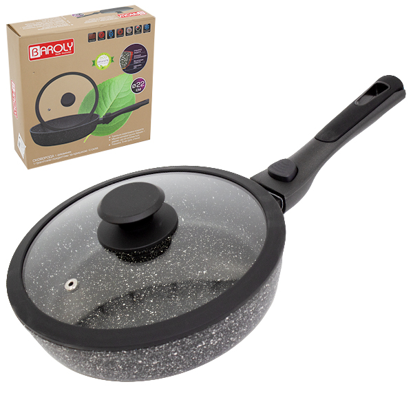 Сковорода МРАМОР 22см, со стеклянной крышкой и съёмной ручкой