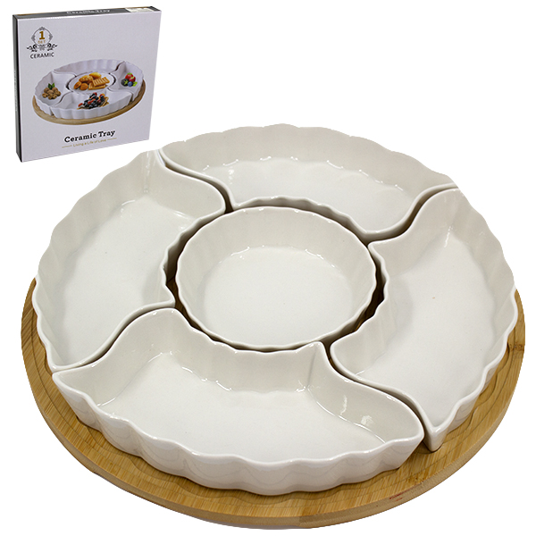 Менажница керамическая Ø-30см (5 раздельных отделений), с бамбуковой подставкой