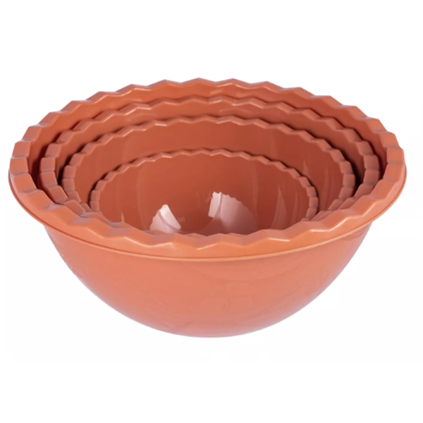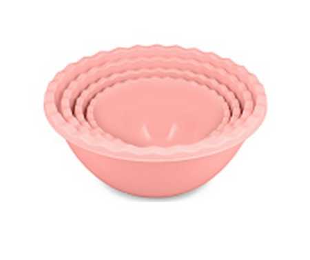 Набор состоит из четырех мисок различного размера. Миски имеют стильный дизайн, волнистые края. Изделия легко мыть, возможно это делать в посудомоечной машине. После использования миски не занимают много места, так как в пустом виде легко умещаются одна в другую.