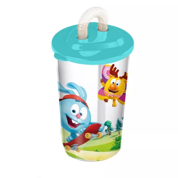 Стакан с трубочкой и декором СМЕШАРИКИ 400мл (Голубой)(то)