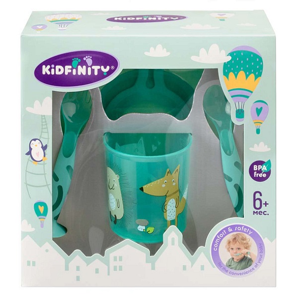 Набор детской посуды от Kidfinity® прекрасный подарок на любой случай. Тарелочка для вторых блюд благодаря присосу не скользит по поверхности стола. Широкие края с прорезиненными вставками помогут малышу уверенно держать тарелку в руках. Кружка благодаря нескользящему дну устойчива на столе, что уменьшает риск ее опрокидывания. Кружка имеет небольшой вес и удобную ручку, это позволяет малышу легко держать ее самостоятельно. Через прозрачные стенки хорошо виден уровень жидкости. Декор нанесен с помощью технологии IML, поэтому изображение не сотрется и не отклеится. Ложечка и вилочка с безопасными закругленными зубчиками облегчат процесс кормления малыша и обучения его самостоятельному питанию. Эргономичные ручки столовых приборов имеют специальные нескользящие вставки. Присосы позволят зафиксировать приборы на поверхности стола, избежав загрязнений.