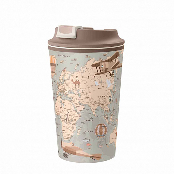 Термостакан 350мл с декором и клапаном "КАРТА" (светло-бежевый) (то)