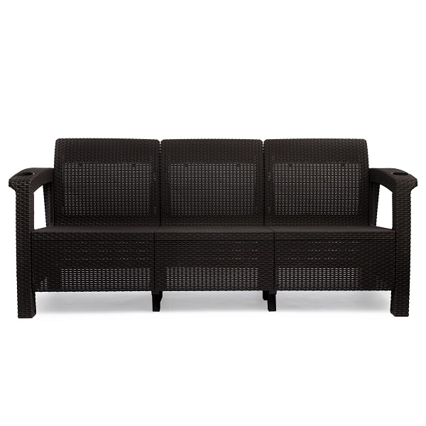 Диван произведен из высококачественного полипропилена, имитирующего плетение из ротанга. Диван имеет три посадочных места, допустимая нагрузка на одно посадочное место - 106 кг (318 кг). На подлокотниках дивана расположены отверстия для напитков. Диван может стать идеальным решением по оформлению зоны отдыха в доме, на садовом участке, в офисном помещении или в кафе. Благодаря цветовым решениям, диван подойдет под любой интерьер. Диван упаковывается в индивидуальную упаковку, инструкция по сборке прилагается.Зону отдыха также можно дополнить журнальным столиком и креслами серии «Ротанг-плюс».
