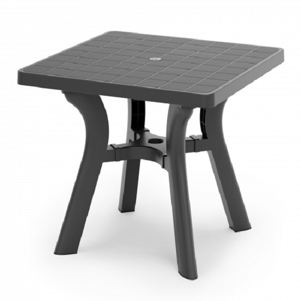 Стол квадратный "Атлант" имеет прочную конструкцию и устойчивый каркас, выдерживает воздействие внешних факторов, не теряя своего первоначального облика и качества. Изогнутые ножки соединены между собой крестовиной, что придает столу особую устойчивость. Ножки регулируются по высоте. Конструкция полностью разборная, что облегчает транспортировку и складирование. В центре столешницы имеется отверстие с заглушкой для установки зонта. Скругленные углы обеспечат более безопасное использование. Особенность данного стола в текстуре столешницы, которая эмитирует дерево.