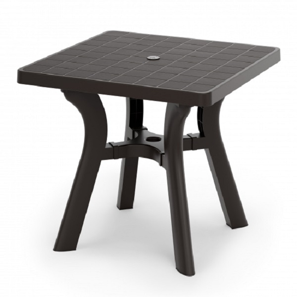 Стол квадратный "Атлант" имеет прочную конструкцию и устойчивый каркас, выдерживает воздействие внешних факторов, не теряя своего первоначального облика и качества. Изогнутые ножки соединены между собой крестовиной, что придает столу особую устойчивость. Ножки регулируются по высоте. Конструкция полностью разборная, что облегчает транспортировку и складирование. В центре столешницы имеется отверстие с заглушкой для установки зонта. Скругленные углы обеспечат более безопасное использование. Особенность данного стола в текстуре столешницы, которая эмитирует дерево.
