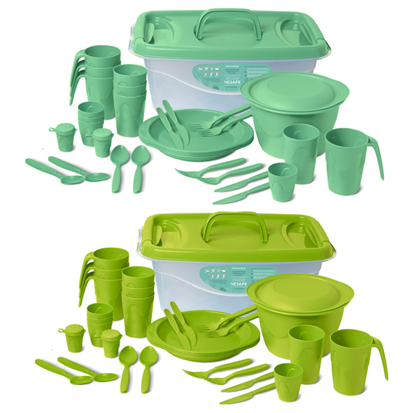 Набор для пикника «Чезаре» помещается в пластиковый контейнер объемом 16л. и состоит из 31 предмета: миска с крышкой 3л. (1шт.), емкости для специй (2шт.), тарелки для вторых блюд (4шт.), вилки (4шт.), ложки (4 шт.), ножи (4 шт.), стопки (4 шт.), стаканы для холодных напитков (4 шт.), кружки для горячих напитков (4 шт.). Посуда выполнена из качественного пищевого пластика и разрешена для контакта с пищевыми продуктами. 472x312x186мм