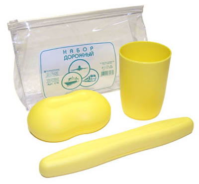 Дорожный набор содержит самые необходимые аксессуары для личной гигиены, который удобно взять в поездку: герметично закрывающаяся мыльница, универсальный футляр для зубной щетки, непрозрачный пластиковый стаканчик. Набор упакован в прозрачную косметичку с замком, что позволяет перевозить предметы гигиены, не опасаясь попадания загрязнений от мыла и зубной пасты на прочие предметы багажа.